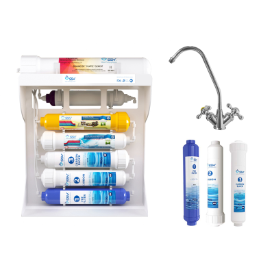 دستگاه تصفیه آب SF4800 با بهرهگیری از ۱۰ فیلتر پیشرفته در مراحل مختلف، به صورت تخصصی طیف وسیعی از آلایندهها و ناخالصیها را حذف میکند. از فیلترهای الیافی برای جذب ذرات معلق گرفته تا فیلتر ممبران با قدرت بالا برای حذف نیترات، نیتریت، جیوه، شوری و سایر فلزات سنگین، این دستگاه عملکردی کامل در تصفیه آب دارد. سایر فیلترها نیز بهبود طعم، بو، قلیاییسازی و اکسیژنرسانی به آب را بر عهده دارند. البته باید بدانید که هر فیلتر به طور میانگین تا یک سال عمر مفید دارد و به راحتی قابل تعویض است.